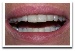 Bij Debbie waren maar twee snijtanden aangelegd i.p.v. vier. Op de eerste foto is duidelijk te zien dat er dan te veel ruimte tussen de tanden onstaat en de hoektanden, die bijna op de plaats staan van de ontbrekende snijtanden, zijn puntig van vorm. We hebben hier 6 facings van porselein geplaatst, waarbij de hoektanden de normale snijtanden-vorm kregen en de eerste kiezen achter de hoektand de vorm van een hoektand.